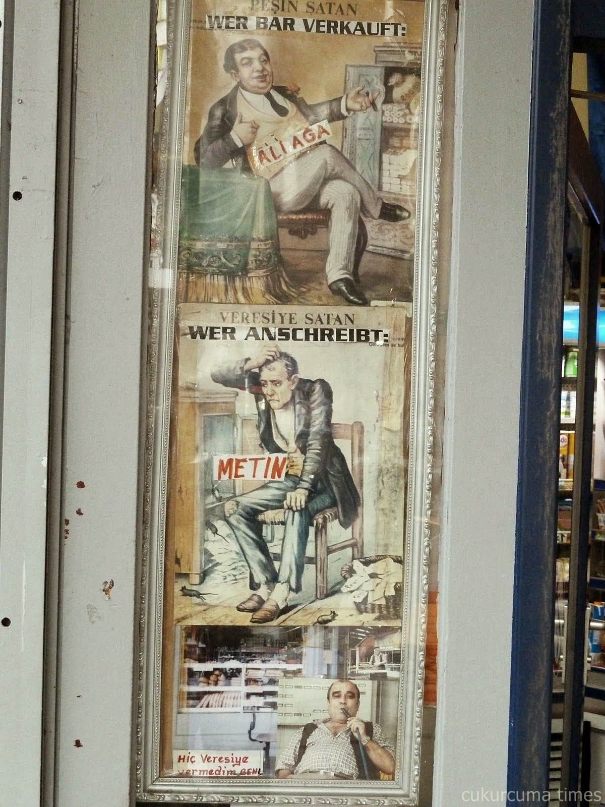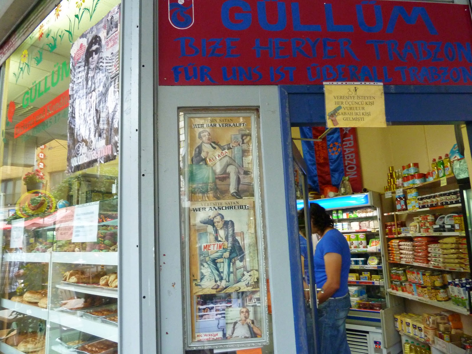 Merdivenlerin hemen altında ise, Berlin’in Türkçe rap aleminin eskilerinden ‘Killa Hakan’ın babasının bakkalı. Oğlunun posteri, peşin satan ve veresiye satan arasındaki farkı gösteren meşhur poster ve para ile şaka olmayacağını, veresiye işlere bulaşmayacağını belirten bir küçük esnaf esprisi klasiği: ölümle tehdit. ‘Hiç veresiye vermedim ben’ diyen ise tüm gün bakkalının önünde nargilesini fokurdatan sahibi.