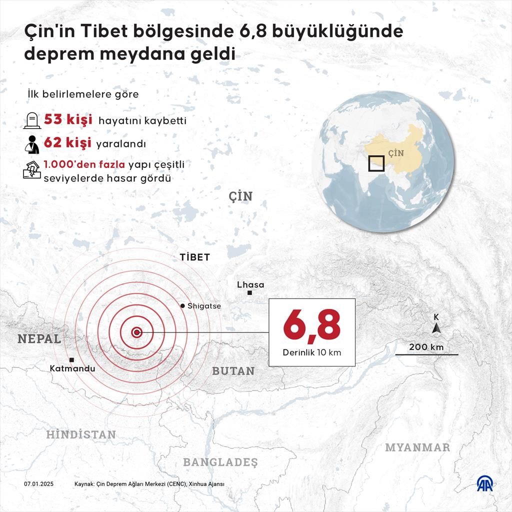 Tibet’in kutsal kenti Şigatse’de yerel saatle 09.00’da meydana gelen depremin büyüklüğü 6.8 olarak kaydedildi. Ayrıca bölgede bir dizi artçı sarsıntı daha meydana geldi. ABD Jeolojik Araştırmalar Merkezi (USGS) ise depremin büyüklüğünü 7.1 olarak duyurdu.